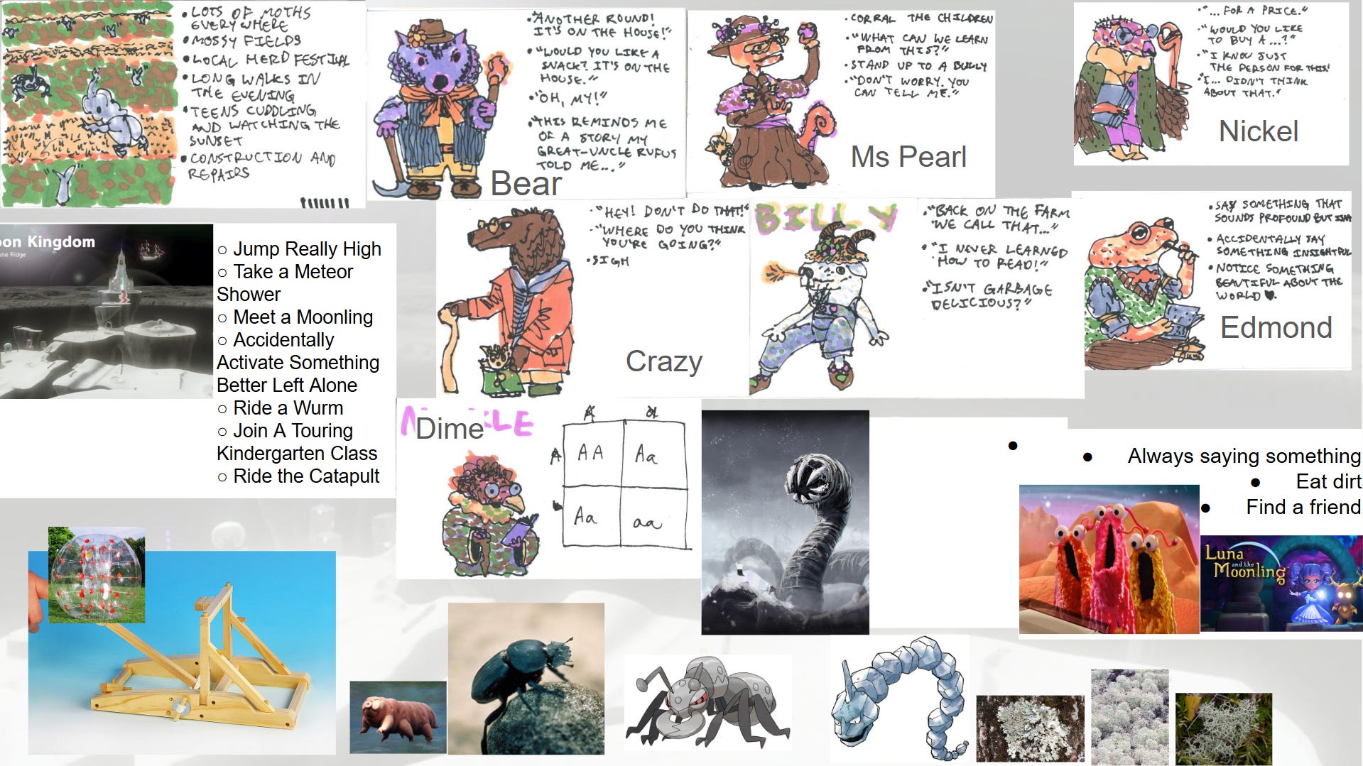 Eventually I realized that I needed a setting and a system designed to support each other. To learn about this we turned to a game called Wanderhome, where you play as fantasy animal people traveling the countryside.