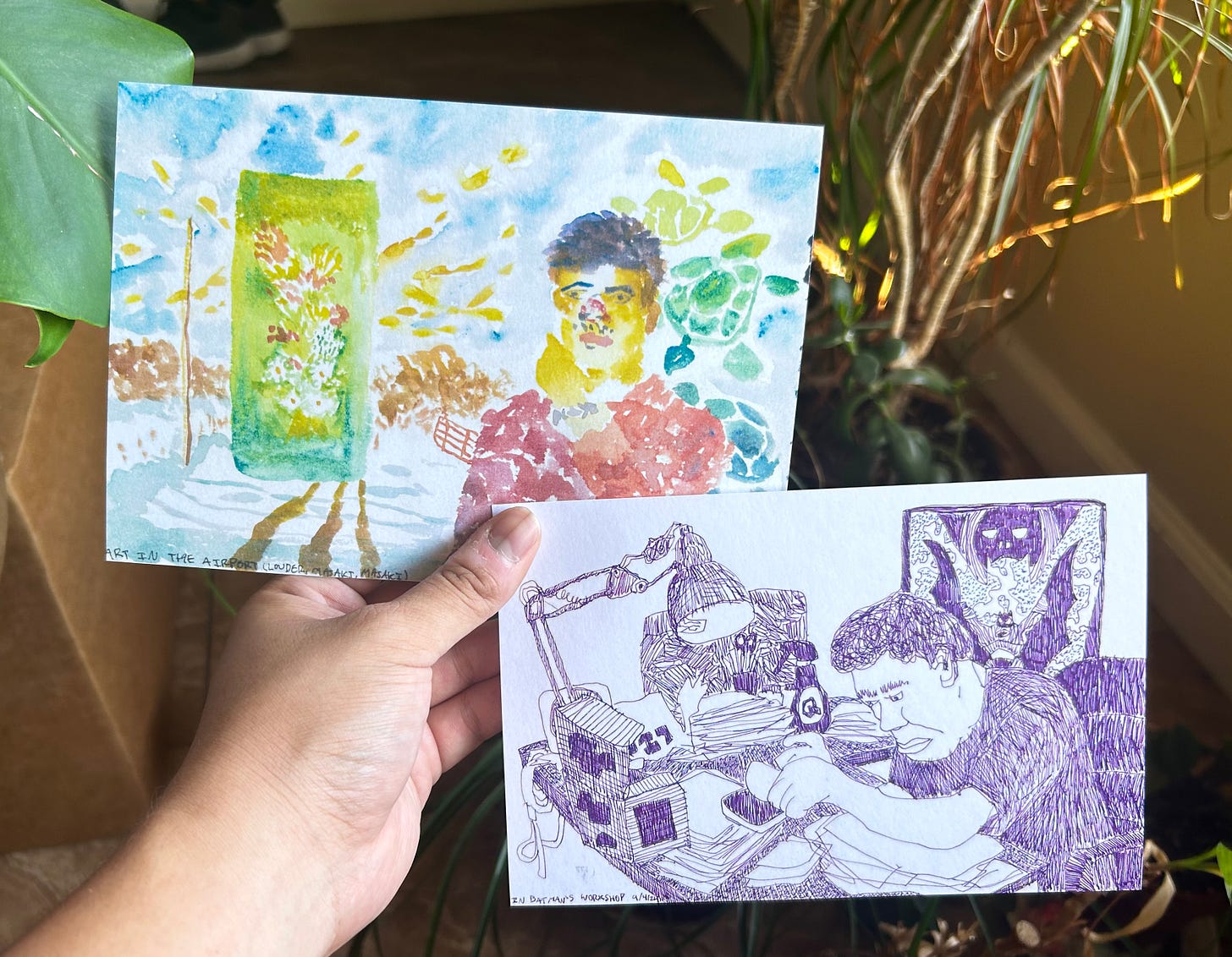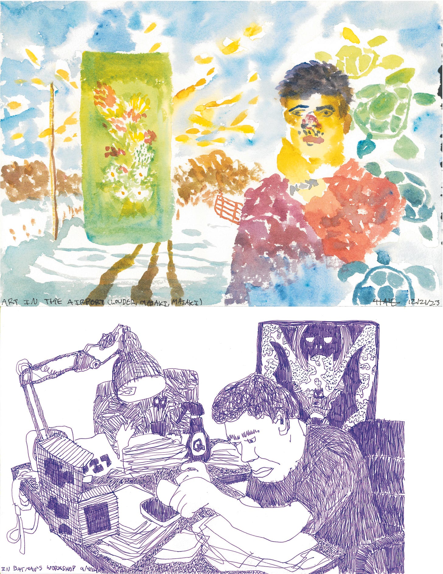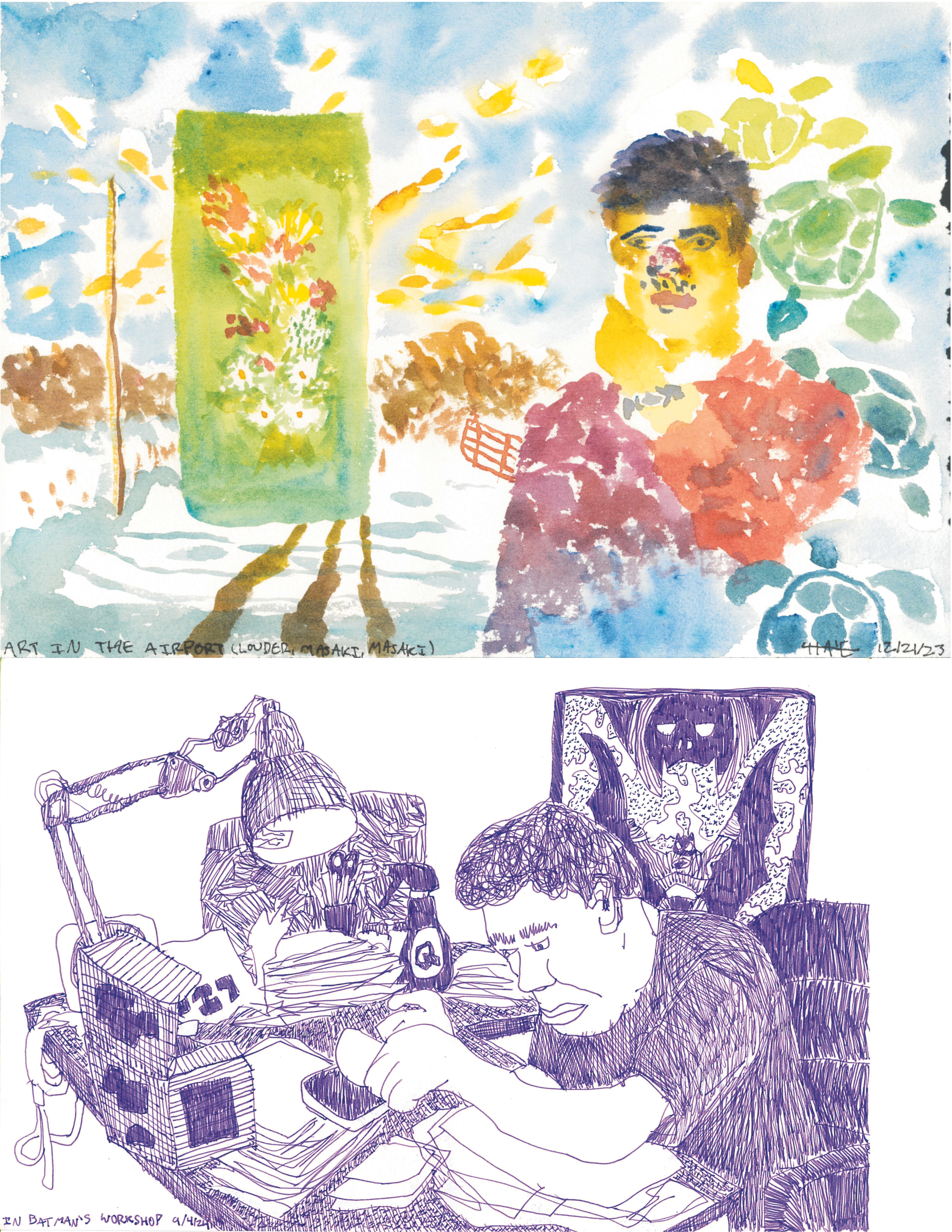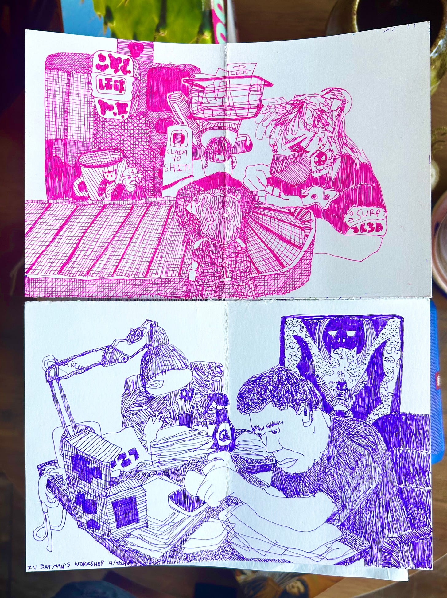 Anyway, I’ve decided that for your generous donation, you’ll receive some fun prints in the mail each month! Above are September’s prints, DADONOMICON parts 1 and 2. Art in the Airport (Louder, Masaki, Masaki) includes a painting of a photograph of my Dad in his twenties, as well as a painting of an embroidery piece done by my Grandma. In Batman’s Workshop is a drawing of my Dad replacing the screen protector on my phone. I really love drawing piles of stuff, and my Dad was an excellent model. We even had a fun Bob Ross moment as I walked him through what I was thinking while shading in the different parts of the drawing!