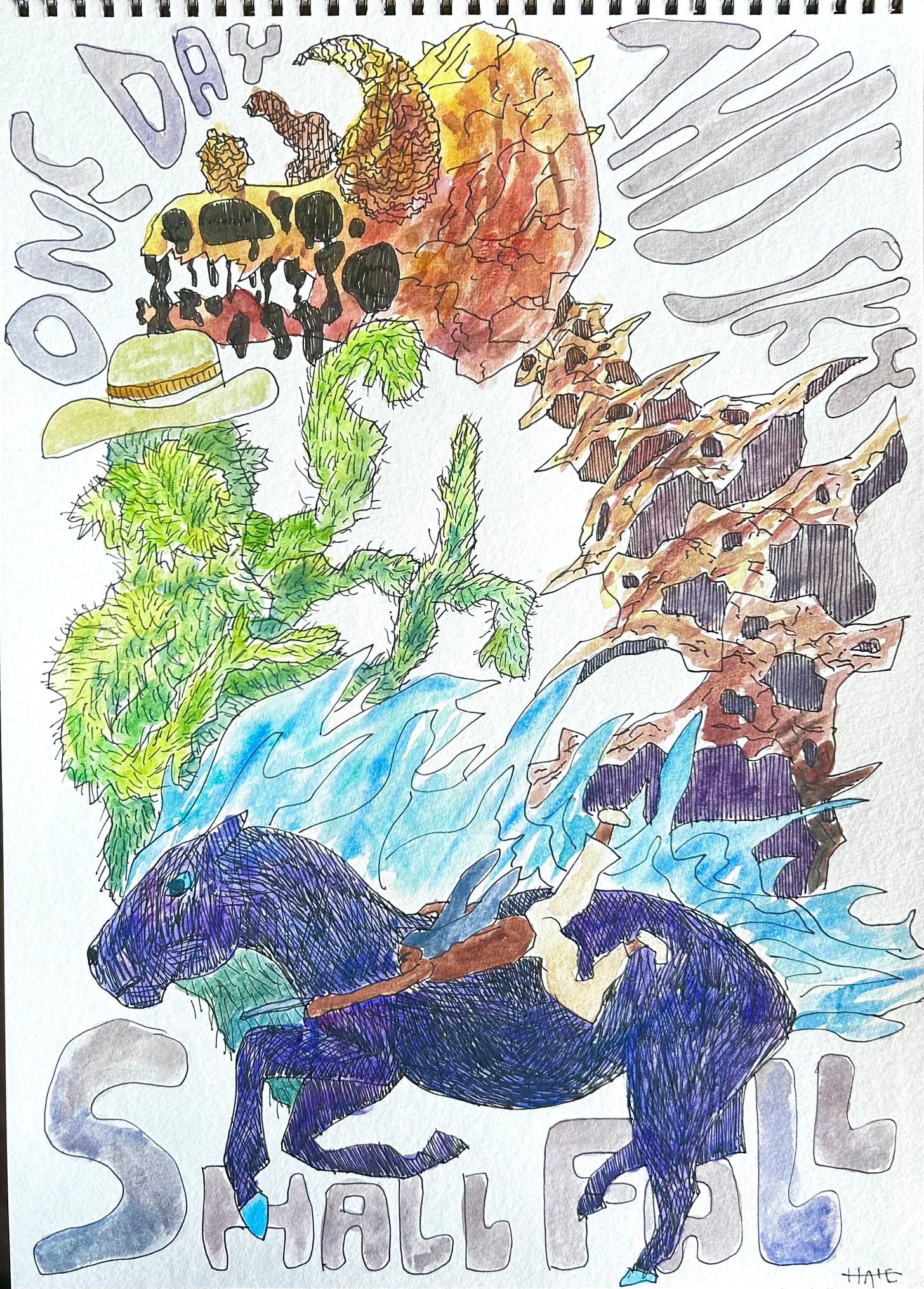 The drawing above I posted the linework for a while ago, but I’m not sure when I actually painted it. The text refers to a game I’m working on called GLOBAL DOOM 99, where the planet’s water hovers just outside the atmosphere. You probably saw a drawing of this last week: